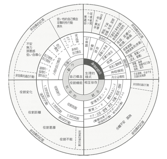- 自己概念様式:精神的な不安や自己の身体や性格、自分らしさなどのイメージや自己期待、価値観の変化・反応。