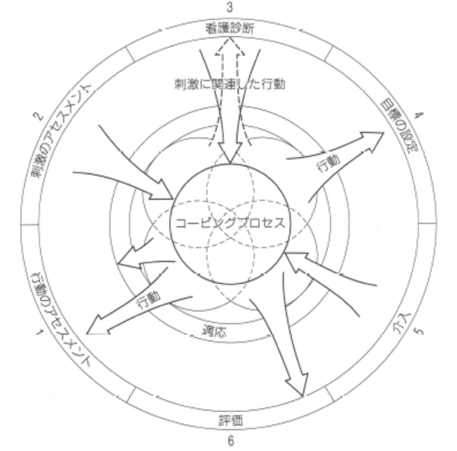 適応看護モデルでの看護実践では、①行動のアセスメント、②刺激のアセスメント、③看護診断、④目標設定、⑤介入、⑥評価の6ステップで構成された看護過程を用いて、看護目標に対して看護介入が行われます[図2]。