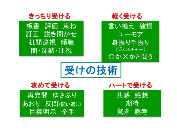 「学生の意見を拾った=受けた」にとどまらず、それをどのように束ねて、どのように学生に返していくのかということが重要です。言うなれば、「受け」とは、意見を素材に授業を展開すること。拾って終わってしまっては十分な「受け」ではありません。拾って広げることが「受け」のポイントです。