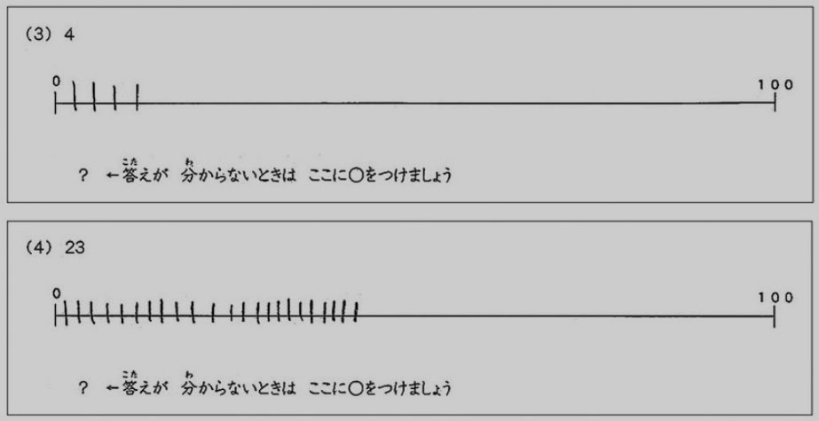 例えば小学生用「かずのたつじん①」(大問1)では、0から100までの数直線上に、与えられた数の位置を線(矢印)で示すという問題を出しました。一見簡単な問題ですが、小学3年生の正答率はなんと40.4%に留まり、0から100までの数直線上に問題で問われている数だけ線を引いている解答[図1]]や、4の時は4 mm、23の時は23 mmのところに線を引いている解答も見受けられました。彼らにとって数はモノを数えたり測ったりするためのものであり、100にしろ1000にしろ、与えられたスケール(尺)の上で、数の位置や量を考えるということができなかったのです。