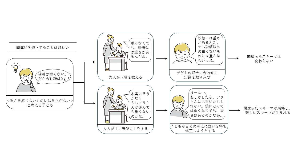 今井 スキーマの修正は非常に難しいことです。スキーマは学習者がさまざまな事例から自分でつくった暗黙の知識なだけに、「○○が正解だよ」と教えられるだけでは簡単には修正されませんし、その「正しい答え」を自分の誤ったスキーマに合うように都合よく解釈さえされてしまいます[図2]。そこで、いかに子どもたち自身で気づくように促せるか、この足場架けこそが、教育者の本当の腕の見せ所だと思います。そしてこれは一朝一夕でできるようになるものではなく、常に考え続け試行錯誤を繰り返す中で、ベストなものを見つけ出す必要があると思います。